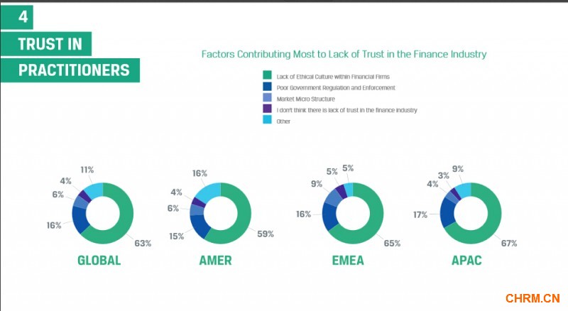 - CFA协会会员持续关注金融市场诚信等问题,超过一半的中国会员认为金融机构内部缺乏道德文化 (53%),加上监管和执法不力 (27%),是投资者对金融业缺乏信任的主要原因