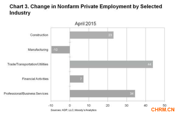 服务领域提供的就业岗位4月上升了170,000个,比3月份增加的172,000个略有下降。ADP全美就业报告显示:专业、商业服务行业在4月贡献了 34,000个工作岗位,明显高于3月贡献的28,000个工作岗位。贸易、运输和公用事业增长了44,000个工作岗位,高于3月的41,000个工作 岗位。金融服务业因金融活动增加了7,000个工作岗位,明显低于上个月增长的12,000个工作岗位。