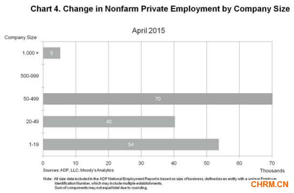 4月,雇员人数少于49人的小型企业增加了94,000个工作岗位,低于3月的105,000个工作岗位。企业规模在50-499名雇员的中型企业增加了 70,000个工作岗位,高于前一个月增长的64,000个工作岗位。规模在500或以上雇员的大型企业与3月相比减少了6000个工作岗位,仅增加了 5,000个工作岗位。企业规模在500—999名雇员的企业继3月增加了2,000个工作岗位后,4月没有增加工作岗位。同时雇员超过1000名员工的 公司增加了5,000个工作岗位,与前一个月增加的4,000个工作岗位相比有小幅提升。