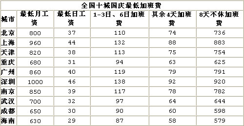 凤凰网财经特别选取了全国十个大中型城市进行最低加班费对比(如下表)。对比结果显示加班费最高的是深圳,国庆中秋八天全部加班将获得最低920元的加班费,与计算基数1000元的最低月工资只相差8%。也就是说,国庆八天全部的加班费差不多是一个月的工资,是当之无愧的黄金周。而较低的则是海南,八天总计最低加班费只有579元。
