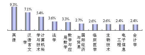 黑龙江省2008届本科毕业生毕业半年后失业量最多的10个专业失业人数占了本科失业量的41.4%,其中有7个专业同时也是2007届失业最多的专业:英语、计算机科学与技术、法学、数学与应用数学、国际经济与贸易、临床医学、会计学。调控这些连续造成较大失业量的专业招生结构,并适当调整此类专业的在校学生结构,可以较快地改善总体就业状况。