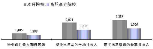 黑龙江省2008届本科毕业生的期待月收入、实际月收入与雇主愿意提供的最高月收入分别为1405元、2071元和2219元;高职高专毕业生的期待月收入、实际月收入和雇主愿意提供的最高月收入则分别为1288元、1618元和1706元。当前大学毕业生对薪资的期待较为理性,本科和高职高专毕业生的期待月收入分别低于实际月收入666元、330元;实际月收入低于雇主愿意提供的最高月收入说明大学生择业时并不以薪资为第一考量,还综合考虑了个人发展空间、企业前景等因素。