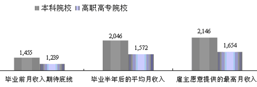 河北省2008届本科毕业生的期待月收入、实际月收入与雇主愿意提供的最高月收入分别为1455元、2046元和2146元;高职高专毕业生的期待月收入、实际月收入和雇主愿意提供的最高月收入则分别为1239元、1572元和1654元。当前大学毕业生对薪资的期待较为理性,本科和高职高专毕业生的期待月收入分别低于实际月收入591元、333元;实际月收入低于雇主愿意提供的最高月收入说明大学生择业时并不以薪资为第一考量,还综合考虑了个人发展空间、企业前景等因素。