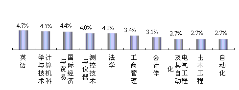 河北省2008届本科毕业生毕业半年后失业量最多的10个专业占了本科失业量的36.2%,其中有5个专业同时也是2007届失业最多的专业:计算机科学与技术、英语、国际经济与贸易、法学、工商管理。调控这些连续造成较大失业量的专业招生结构,并适当调整此类专业的在校学生结构,可以较快地改善总体就业状况。另一方面,河北省2008届高职高专毕业生毕业半年后失业量最多的10个专业占了高职高专失业量的33.1%。
