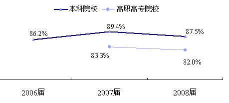 河北省2008届本科、高职高专毕业生对学校的总体满意度分别为82%、74%