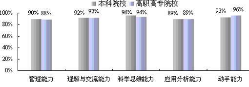 基本工作能力是所有工作都必须具备的能力。广东省2008届本科毕业生35项基本工作能力重要性排前5位的能力满足度较高的为理解他人,较低的为有效的口头沟通。高职高专毕业生重要性排前5位的能力满足度较高的为理解他人,较低的为有效的口头沟通、积极聆听和积极学习。
