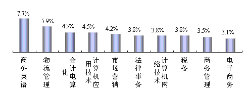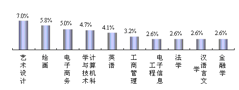 广东省2008届本科毕业生毕业半年后失业量最多的10个专业占了本科失业量的40.2%,其中有6个专业同时也是2007届失业最多的专业:电子商务、计算机科学与技术、英语、工商管理、电子信息工程、法学。广东省2008届高职高专毕业生毕业半年后失业量最多的10个专业占了高职高专失业量的44.8%,其中有4个专业同时也是2007届失业最多的专业:商务英语、物流管理、计算机应用技术、电子商务。调控这些连续造成较大失业量的专业招生结构,并适当调整此类专业的在校学生结构,可以较快地改善总体就业状况。