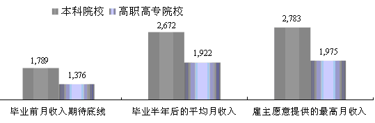广东省2008届本科毕业生的期待月收入、实际月收入与雇主愿意提供的最高月收入分别为1789元、2672元和2783元;高职高专毕业生的期待月收入、实际月收入和雇主愿意提供的最高月收入则分别为1376元、1922元和1975元。当前大学毕业生对薪资的期待较为理性,本科和高职高专毕业生的期待月收入分别低于实际月收入883元、546元;实际月收入低于雇主愿意提供的最高月收入说明大学生择业时并不以薪资为第一考量,还综合考虑了个人发展空间、企业前景等因素。