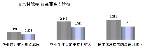 江西省2008届本科毕业生的期待月收入、实际月收入与雇主愿意提供的最高月收入分别为1491元、2141元和2211元;高职高专毕业生的期待月收入、实际月收入和雇主愿意提供的最高月收入则分别为1328元、1761元和1811元。当前大学毕业生对薪资的期待较为理性,本科和高职高专毕业生的期待月收入分别低于实际月收入650元、433元;实际月收入低于雇主愿意提供的最高月收入说明大学生择业时并不以薪资为第一考量,还综合考虑了个人发展空间、企业前景等因素。