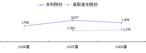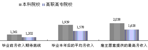 山东省2008届本科毕业生的期待月收入、实际月收入与雇主愿意提供的最高月收入分别为1361元、1939元和2038元;高职高专毕业生的期待月收入、实际月收入和雇主愿意提供的最高月收入则分别为1202元、1578元和1658元。当前大学毕业生对薪资的期待较为理性,本科和高职高专毕业生的期待月收入分别低于实际月收入578元、376元;实际月收入低于雇主愿意提供的最高月收入说明大学生择业时并不以薪资为第一考量,还综合考虑了个人发展空间、企业前景等因素。