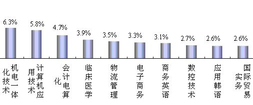 山东省2008届本科毕业生毕业半年后失业量最多的10个专业失业人数占了本科失业量的38.4%,其中有8个专业同时也是2007届失业最多的专业:法学、计算机科学与技术、国际经济与贸易、英语、工商管理、会计学、汉语言文学、市场营销。调控这些连续造成较大失业量的专业招生结构,并适当调整此类专业的在校学生结构,可以较快地改善总体就业状况。另一方面,山东省2008届高职高专毕业生毕业半年后失业量最多的10个专业占了高职高专失业量的38.5%。