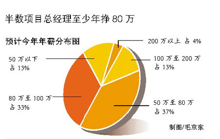 其中,八成的房地产业高管在2009年的薪酬比2008年有所增加,其中45%的项目总经理薪酬增幅超过两成,预计2009年全年收入达到80万(含)以上的项目总经理达到被访者的半数。