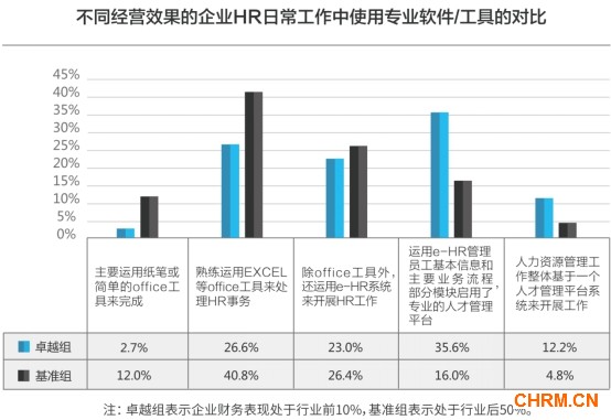 在文化上,大多数企业对核心人才的定义仍模糊,并局限在小范围内。而经营效果卓越的企业对关键人才定义范围更广,高层对人力资源工作参与度更高,用人部门与HR部门配合度更深;在制度上,人力资源部开始主动主导甚至驱动变革来升级人才管理;在技术上,专业化技术提升明显,卓越的企业更多使用软件来管理日常工作,更广泛使用人才评价技术,更注重量化管理;而HR团队的专业性和影响力有小幅提升,卓越企业的HR更贴近战略。