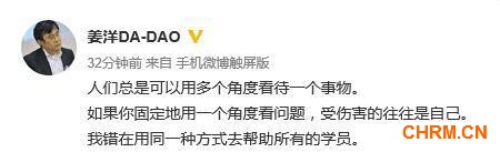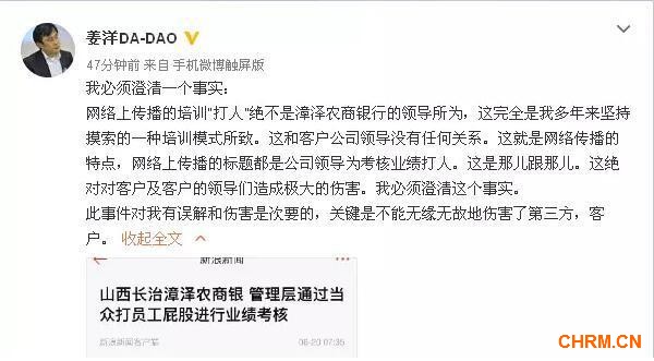 不过随后姜洋表示,要对挨打员工道歉,“我等会儿就会对那些被打的学员进行诚挚道歉,包括书面的等等形式。教学必须因材施教,尽管我用同样的内容和 方式帮助过许许多多的企业,包括多家世界500强企业,但是,我没有注意调整对不同学员的使用不同的方式。这是我的错!既然给有的学员造成伤害,我就必须 给学员道歉!”