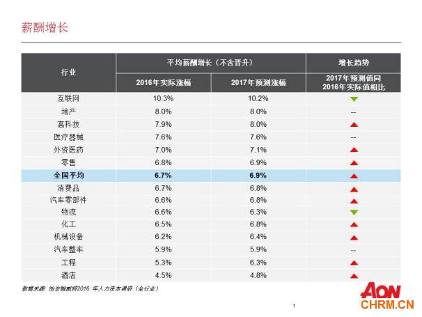 今年,全国平均薪酬涨幅(不含晋升)持续下降至6.7%,与GDP增幅持平,2017年预计平均薪酬涨幅为6.9%(不含晋升)。然而,今年薪酬涨幅行业差异化显著。其中,以互联网(10.3%)领先,地产(8.0%)、高科技(7.9%)和医疗器械(7.6%)位居前列。外资医药(7.0%)和零售行业(6.8%)的薪酬涨幅也高于全国平均,而工程(5.3%)和酒店行业(4.5%)的薪酬涨幅则维持在一个相对较低的水平。
