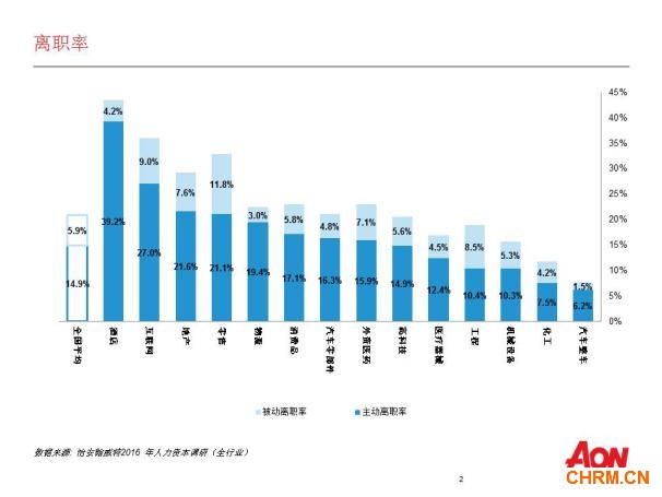 2016年11月14日,中国人力资源经理上海讯–近日,全球著名的人力资源咨询公司怡安翰威特公布了2016年中国人力资本调研结果。2016年中国企业平均员工薪酬增长为6.7%,员工离职率为20.8%,其中主动离职率为14.9%,被动离职率为5.9%。本次调研覆盖了北上广深及主要二三线城市共计3000余家企业,涉及高科技、互联网、地产、金融、医疗保健、汽车、机械设备和工业制造、消费品、零售、化工、物流、工程、酒店等十余个重点行业。