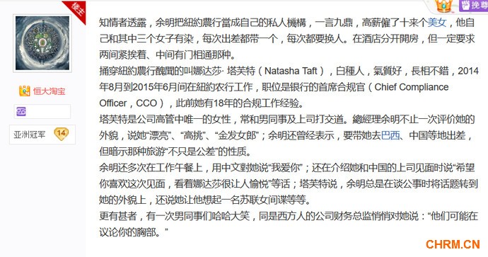 塔芙特是一名漂亮高挑的金发女郎,她是公司高管中唯一的女性。塔芙特说,农行纽约分行的总经理余明总是在谈公事时将话题转到她的外貌上,还多次在工作午餐上用中文对她说〝我爱你〞,甚至曾经表示要带她去巴西、中国等地出差,并暗示那种旅游〝不只是公差〞的性质。