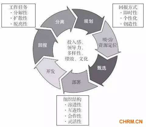 此书首次提出“人力资源开发周期”及引领工作框架。在传统人力资源工作中,这一周期表现为企业全职员工的入职、履职和离职三个阶段,每个阶段具体通过一系列内部岗位得以体现。现在我们尽量避免采用 “ 组织机构及其工作岗位“这样的单一性表述,因为使用”工作“和”工作者“概念更加宽泛,更有利于准确形容职场的工作环境。虽然这些传统阶段依然存在,但未来它们不一定局限于某一家企业之内,也不一定通过固定岗位的形式体现出来。这一框架的三大基本要素分别是工作任务、组织结构和回报方式。我们希望此决策框架可以指导企业发现超职场时代引领工作的系统化解决方案,即如何利用此框架创造性地开发新的工作方式组合,从而实现目标的优化和企业任务的达成。