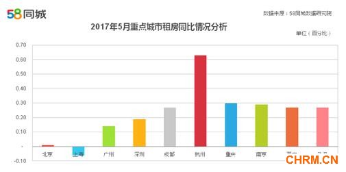 城市发展潜力和租金的优势,使新一线城市的租房需求在毕业季出现明显提升。58同城数据研究院发布的《2017年高校毕业生租房报告》显示,与2016年5月相比,2017年5月新一线城市的租房需求增幅明显。其中,杭州、重庆、南京、成都、西安五个城市排名前五。杭州的租房需求同比增加了63%,而曾经备受关注的一线城市上海,租房需求首次呈现了同比负增长。