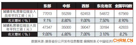 其次跟西部地区的产业结构有关。“西部的产业发展偏重于矿业和原材料工业,大企业比较多,工资相对规范,由此导致西部地区统计出来的工资相对高一些。”