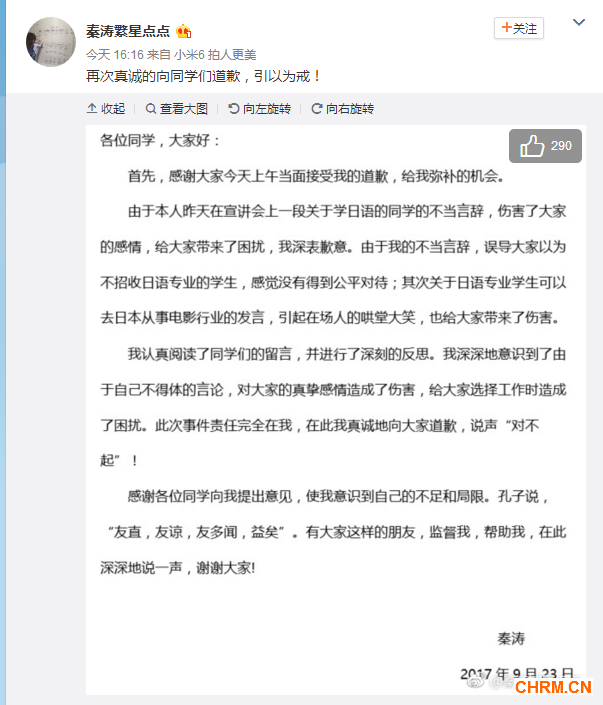 涉事员工今日下午在个人微博发布声明,承认自己当时言辞不当,并称已在今日上午向学生当面道歉。
