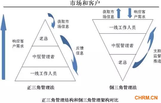 随着国外管理模式的升级,国内经济的发展,从制造业过渡到服务业以及“90后”劳动力成为新一代劳动力的变化,企业组织的管理体系也必然需要变革,才能更好地组织协作,产生更高的生产力。众多企业已经开始从正三角组织形态向倒三角组织形态转变。
