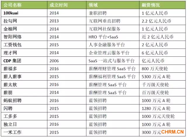 在美国,2016年7月微软以262亿美元收购linkedIn,8月任仕达以4.2亿美元收购传统招聘网站Monster。在中国,FESCO、Adecco和蚂蚁金服集团合资成立人力窝;腾讯与深圳人社局签署战略合作,打造“互联网+城市服务”,着重围绕人才、社保、医保等领域;阳光保险20亿注资易才集团;伯乐遇马天使投资公司与宁波人力资本投资控股有限公司联合发起规模4000万元的人力资源产业基金;伯乐遇马与杭州高科联合发起规模1亿元的人力资源产业并购基金;英格玛人力集团设立英格玛人力资源技术基金;宁波市设立宁波人力资源技术基金等等。这些涌入人力资源服务行业的资金,一方面将加速人力资源服务初创企业的发展,另一方面将促进企业并购和产业整合。英飞尼迪投资集团董事总经理陈小刚分享了近年来中国获得投资的企业列表,说明了资金推动下的产业发展态势:
