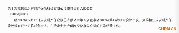 12月12日,永安保险已经召开第五届董事会2017年第13次临时会议审议,由公司副总裁刘雄担任永安保险临时负责人,主持永安保险日常经营工作。