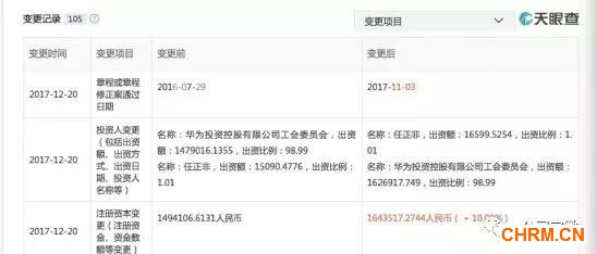在2017年12月,华为控股刚刚完成了注册资本的变更,工商资料显示,2017年12月20日,华为控股注册资本已经由149.41亿元变更为164.35亿元。此次增资中,工会委员会出资额由147.9亿元上升至162.69亿元,任正非个人出资额由1.51亿元增至1.66亿元,双方出资额较去年增幅均为10%。增资后,工会委员会和任正非出资占比各为98.99%和1.01%,比例不变。