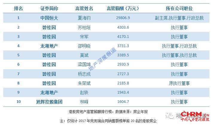 除夏海均常年盘踞在港股薪酬榜“俯瞰众生”,记者放眼望去,2017年港股薪酬榜前十名中,碧桂园占了大部分。