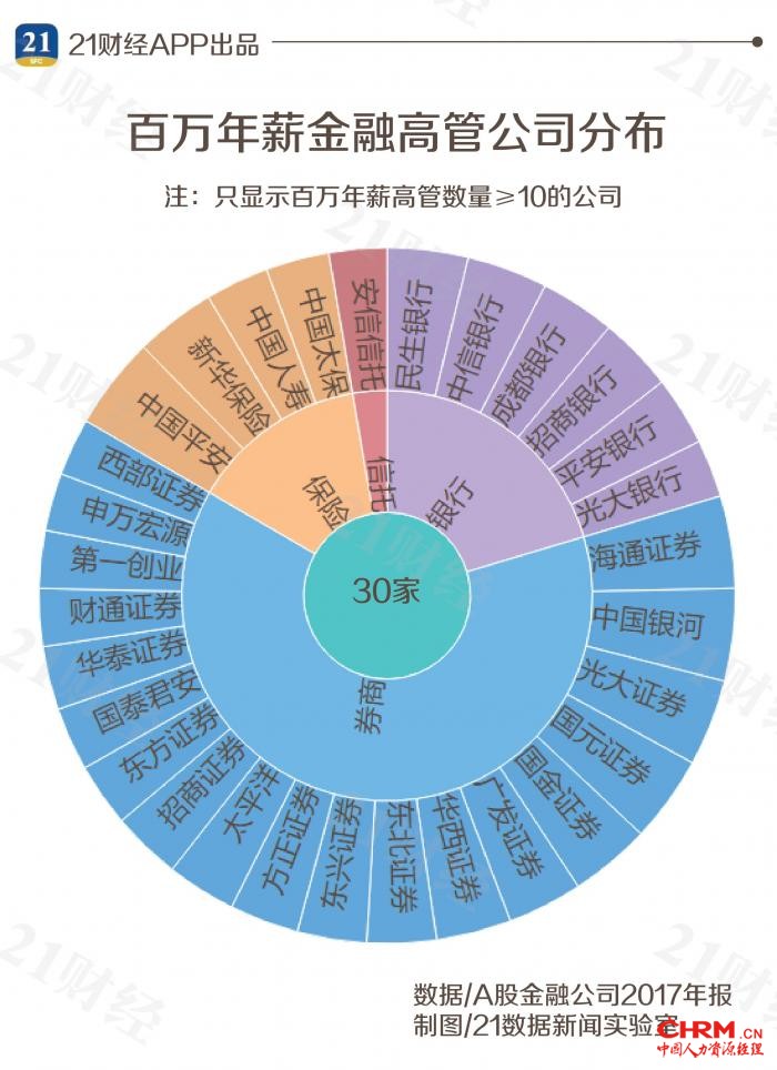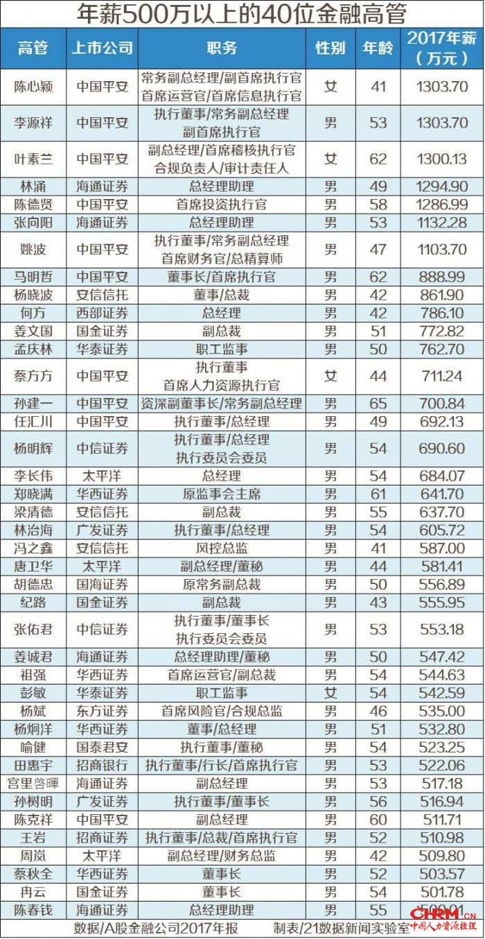 21数据新闻实验室统计发现,2017年上市金融高管薪酬超过500万的有40人,其中券商26人,海通证券(11.470, 0.10, 0.88%)最多,保险10人均来自中国平安(63.040, 1.04, 1.68%),二者合计占比九成;剩下的安信信托(9.180, 0.04, 0.44%)3人,银行系统仅招商银行(30.460, 0.66, 2.21%)行长田惠宇入围。