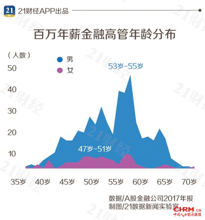 有意思的是,21数据新闻实验室还发现,53岁-55岁是金融业男高管的黄金年龄,而女高管的黄金年龄则在47-51岁。