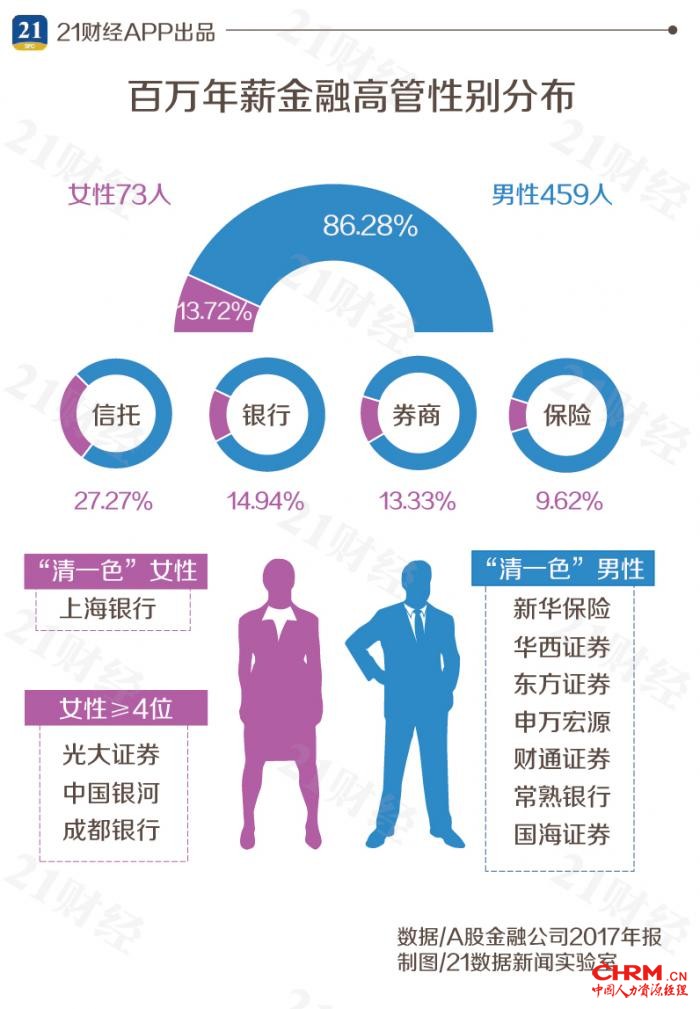 相较而言,保险偏爱男性,信托钟意女性。据21数据新闻实验室统计,银行、券商百万年薪高管女性比例与金融业基本一致,但在保险业这一比例不足10%,信托则高至30%。