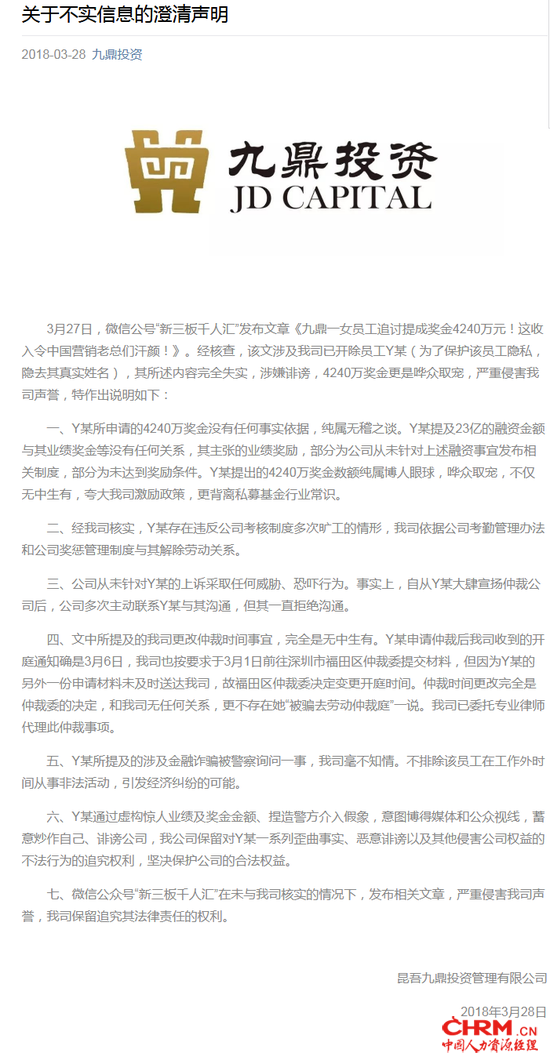 3月27日,微信公号“新三板千人汇”发布文章《九鼎一女员工追讨提成奖金4240万元!这收入令中国营销老总们汗颜!》。经核查,该文涉及我司已开除员工Y某(为了保护该员工隐私,隐去其真实姓名),其所述内容完全失实,涉嫌诽谤,4240万奖金更是哗众取宠,严重侵害我司声誉,特作出说明如下: