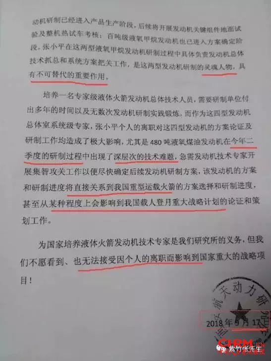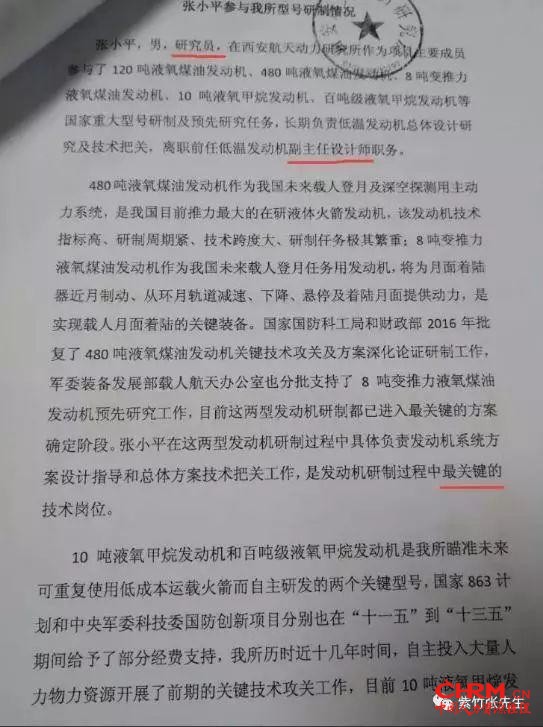 公文大意是:曾在601所担任副主任设计师的研究员张小平离职了,之后相关发动机技术难题攻克不了。