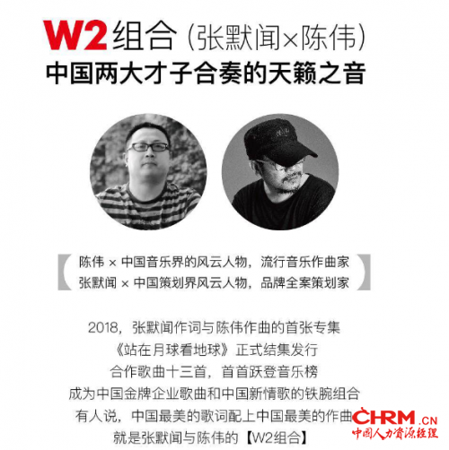 张默闻这厮和陈伟被不少媒体誉为、中国两大才子合奏的天籁之音的“W2组合”称号。2018年,张默闻作词与陈伟作曲的首张专集《站在月球看地球》即将正式结集发行,合作歌曲十三首,首首跃登音乐榜,成为中国金牌企业歌曲和中国新情歌的铁腕组合。有人说,中国最美的歌词配上中国最美的作曲,就是张默闻与陈伟的“W2组合”。加之实力派唱将王峰的精湛演唱,整首歌曲好评如潮,又一经典曲目就此诞生!