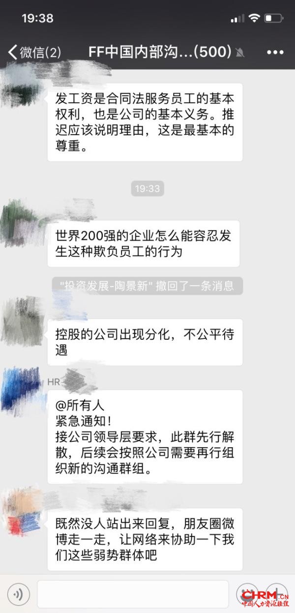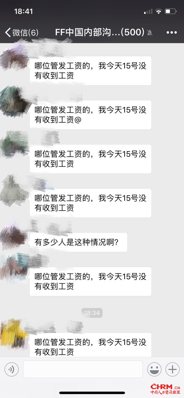 昨日晚间,有员工在FF中国500人的微信群中反应未收到工资一事,就有领导要求HR解散该群组,并表示“后续会按照公司需要再行组织新的沟通群组”,但截至发稿,该内部人员表示,目前仍未有人与被停薪员工进行沟通,更没有建立新的沟通群组。