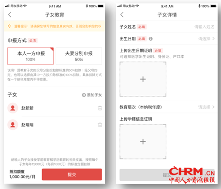 针对子女教育申报项需要的各个电子文件列出明显的描述,以防员工上传了错误的电子材料。通过选择的不同申报比例,子女数量,系统自动计算出抵扣额度。针对法律规定的子女年龄做系统校验,提供子女身份信息上传。