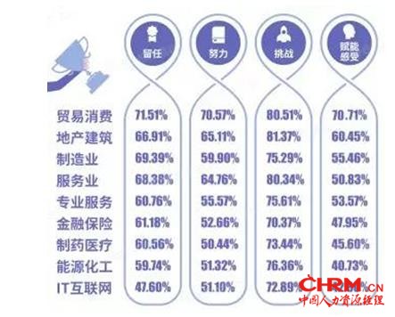 在员工努力和挑战方面,自带“高压”标签的金融保险和自带“热血”标签的IT互联网等行业却意外地偏低。最后,在赋能感受方面,不同行业的企业间显示出了非常大的差异。