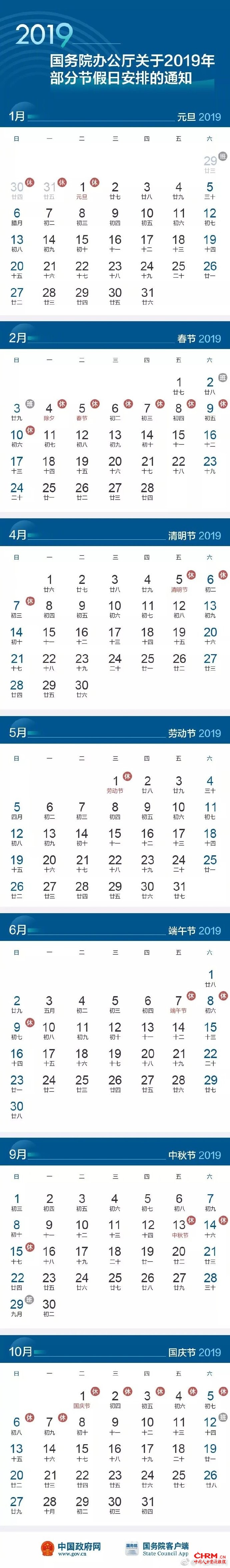 12月6日消息,国务院办公厅关于2019年部分节假日安排的通知: