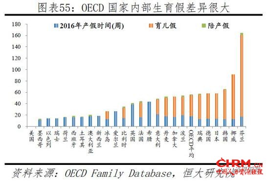第一,立法保障休假,OECD不少国家设置了3-5个月产假、6-35个月育儿假,产假平均为4.5个月,育儿假平均为9.2个月,陪产假平均为1周。早在1877年,瑞士就通过立法为妇女提供8周产假,19世纪末20世纪初,产假政策已经扩展至众多欧洲国家。2016年75%的OECD国家拥有3-5个月产假,产假平均为18周,即4.5个月;56%的OECD国家拥有6-35个月的育儿假,也有12个国家没有设置育儿假,OECD国家育儿假平均为37周,即9.2个月。育儿假一般在产假之后使用,时间更长。其中,爱沙尼亚妇女可享受20周带薪产假和146周带薪育儿假,时间最长;美国无国家法定带薪生育假,联邦政府只设置了12周的无薪产假,但加州等地有规定带薪产假。各国妇女在休假期间可享受的薪资水平存在差异,比如德国和日本的产假均为14周,育儿假均为44周,但产假补偿率分别为100%、67%,育儿假补偿率分别为65%、60%。为对各国的产假和育儿假时长进行对比,OECD把休假期间薪资统一换算成平时薪资的100%,计算出女性总假期长度。换算后,OECD各国女性总假期平均为30周,约7.5个月。其中,爱沙尼亚、匈牙利总假期长度达85周、72周,排名居前;澳大利亚、新西兰分别为7.6、7.7周,排名倒数。中国规定产假为14周、无育儿假,各地在实践中一般将产假设为18-23周,并有7-30天的男方陪产假。