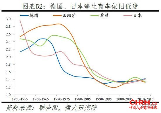 日本在1970年代之前一度控制人口,从1990年代开始鼓励生育,但2016年总和生育率仍停留在1.4,低生育率导致日本人口于2008年见顶、2100年将比峰值减少53%,并且老龄化高龄化程度为全球之最。日本总和生育率1950年为3左右,1974年持续下降至2.05,2005年为1.26、为历史最低,2016年仅回升至1.44,尚未回到理想水平。在长期的低生育率背景下,2008年日本人口见顶,为1.28亿。根据日本统计年鉴中的预测,到2050年日本人口将降至1.02亿、比峰值减少约20%,到2100年日本人口降至不到6000万、比峰值减少53%。并且,日本是全球老龄化高龄化程度最严重的国家,1950-2017年65岁及以上人口占比从4.9%快速增至27.7%,其中80岁及以上人口占比从0.4%增至7.0%;预计2050、2100年日本65岁及以上人口占比分别达37.7%、38.3%,高龄化问题将更为突出。
