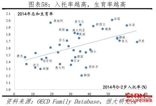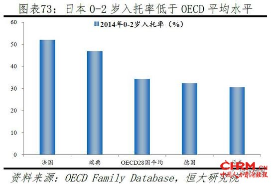 3)完善的儿童托幼服务体系,法国2014年0-2岁入托率达51.9%,远高于OECD水平。根据法国政府官网,法国的儿童托幼服务体系齐全:1)集体托儿所、微型托儿所、企业托儿所、日托中心、多中心设施、幼儿园等集体接待机构;2)雇用幼儿园助理在助理家中照料1-4名儿童的家庭接待机构,3)雇佣保姆住到雇主家中照顾孩子的家庭看护,4)上学前后和放假时组织娱乐和教育活动的“娱乐接待员”。无论采取哪种方式,法国家庭津贴基金(CAF)都会提供资助。如一个月收入为3000欧元、有1个孩子且每月需要监护30小时的家庭,把孩子送去集体托儿所或者幼儿园每月仅需要付54欧元;如果请保姆到家中照顾孩子,那么雇主最少可以仅出15%的费用。根据OECD数据,2014年法国0-2岁入托率为51.9%,在所有OECD国家中排名第八,高于OECD平均水平的34.4%。