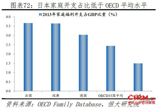 二是日本鼓励生育力度较弱,家庭福利开支占比仅1.5%,在OECD国家中排名倒数。根据日本国立社会保障和人口问题研究所,1980-2014年日本各项社会支出占GDP比重从10.4%上升至23.9%,但用于家庭的支出占GDP比重仅从0.47%上升至1.34%。根据OECD数据,2013年日本家庭福利开支仅占GDP的1.49%,低于OECD平均水平的2.43%,在OECD国家中排名倒数。其中,现金补助和税收返还组成的经济补贴占GDP比重仅为1.03%,在OECD国家中位于中低水平。比如,在托幼方面,根据OECD数据,2013年日本0-2岁入托率仅为30.6%,低于OECD28国平均水平34.4%,且远低于法国的51.9%和瑞典的46.9%。