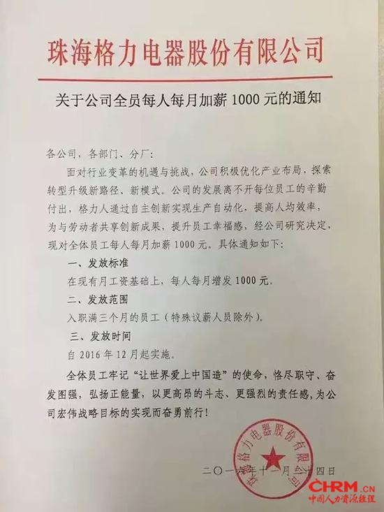 2016年11月24日晚,格力电器给全员涨工资的文件迅速传遍网络。