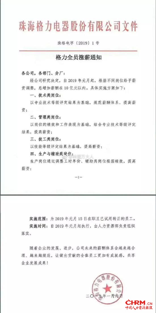 1月8日,格力电器当天下发内部文件,宣布全员涨薪,总增加薪酬在10亿元以内。
