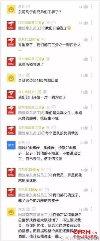 2018年11月,就有网友在社交平台爆料,称京东准备裁员。随后,有京东员工评论附和,“我们部门三分之一到四分之一”、“我们是先裁未婚未育女生”、“每个团队按比例裁”。有评论对此贴出具体比例:金融15%淘汰率、商城10%起步。更有传言称,京东整体裁员比例在35%。