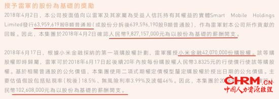 年报披露,2018年小米的5位最高薪酬人士,最高的一位薪酬介于1.5亿港元至150亿港元,其余4位均在3000万港元至1亿港元之间。