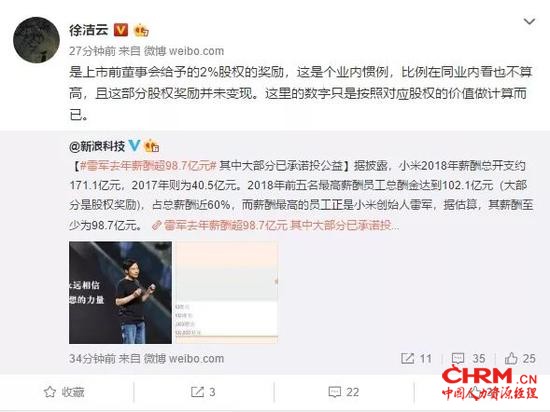 ink="" />对此,小米小米集团公关部总经理转发上述报道在微博回应称:“是上市前董事会给予的2%股权的奖励,这是个业内惯例,比例在同业内看也不算高,且这部分股权奖励并未变现。这里的数字只是按照对应股权的价值做计算而已。”