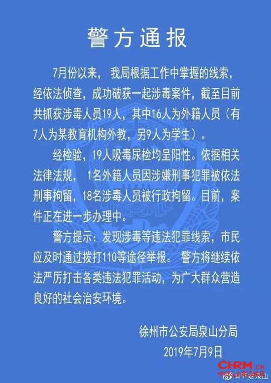 7月9日晚间,徐州市公安局泉州分局发布警方通告,通告称警方成功破获一起涉毒案件,截止目前共抓获涉毒人员19人,其中16人为外籍人员(有7人为某教育机构外教,另9人为学生),目前该案件正在进一步办理中。